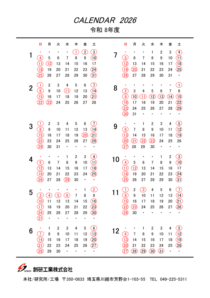年末のご挨拶 2025年12月29日 2025年12月29日 / お知らせ 本年も残すところあと僅かとなりました。皆様には格別のご愛顧を賜り厚く御礼申し上げます。来年も皆様にとって良い年になりますようお祈り申し上げます。さて、当社の年末年始の休業期間は下記の通りとさせていただきます。■年末年始休業期間 2025年12月27日(土) ~ 2026年1月4日(日)併せて、2026年弊社カレンダーをお知らせいたします。来年も相変わらぬご愛顧を頂けますようお願い申し上げて、年末のご挨拶とさせて頂きます。創研工業㈱ 社員一同